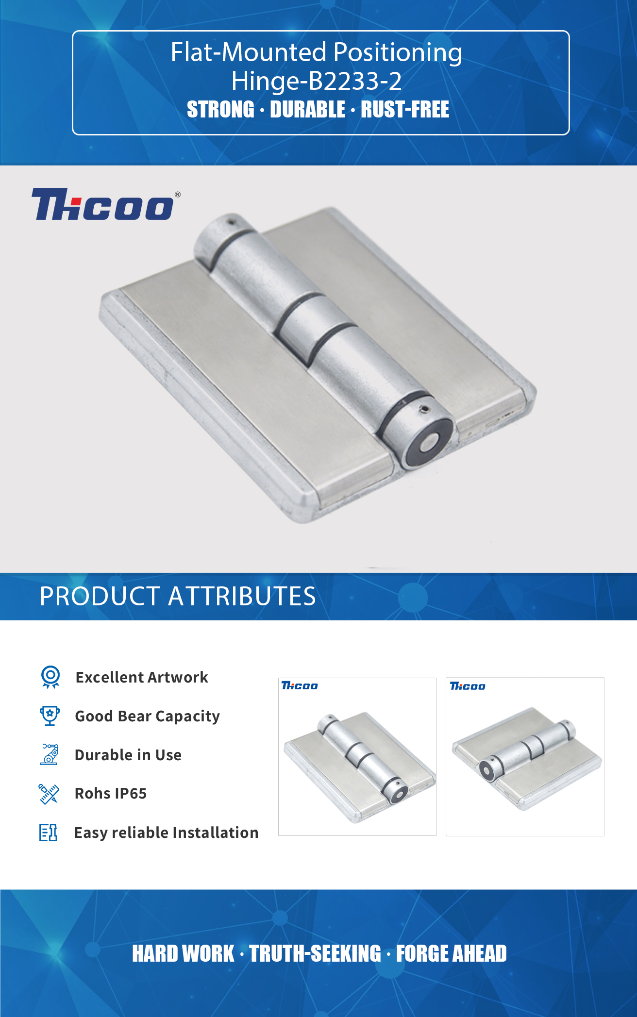 Máme vlastní testovací laboratoř a pokročilé a kompletní kontrolní zařízení, které může zajistit kvalitu produktů. Plochý polohovací pant-B2233-2 se používá v různých aplikacích, kde je důležité držet dveře, okno nebo jiný panel v určité poloze, když se nepoužívá. Zařízení pro přidržování otevřených dveří: Tyto panty jsou často se používá k udržení dveří otevřených pod určitým úhlem, což umožňuje snadný průchod dveřmi.