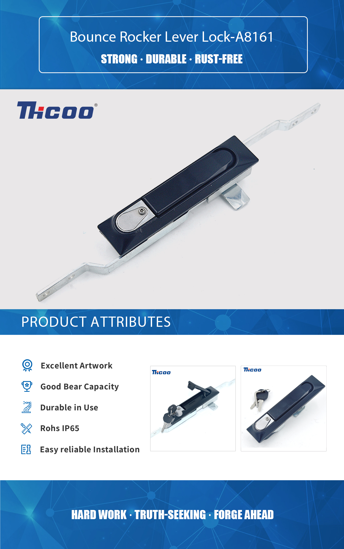 Máme vlastní testovací laboratoř a pokročilé a kompletní kontrolní zařízení, které může zajistit kvalitu výrobků. Bounce Rocker Lever Lock-A8161 je typ zámku, který používá vahadlový pákový mechanismus a pružinovou západku k zajištění dveří nebo jiné zařízení. Kolébková páka se pohybuje klíčem nebo jiným nástrojem, aby se odblokoval mechanismus a umožnilo otevření dveří. Pružinová západka se při zavření dveří odrazí zpět na místo a pomáhá tak udržet dveře bezpečně uzamčené.